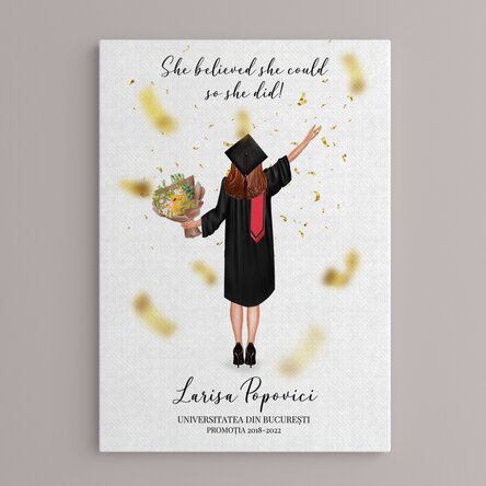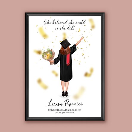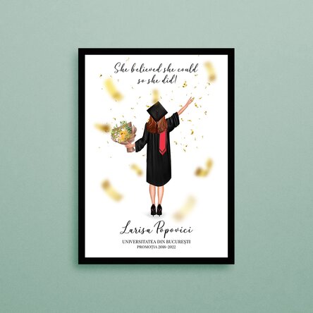 Creează o amintire de neuitat printr-un simplu cadou! Cei mai frumoși ani sunt din timpul facultății, așa deosebiți de iți vine să îi pui în ramă! Iar când vine vorba de o ea, îi poți crea cel mai deosebit tablou! Ai posibilitatea să te apropii cât mai mult de culoarea parului ei, să o motivezi cu un mesaj inspirat și să menționezi numele ei și facultatea absolvită! Ce pot personaliza? Printul poate fi personalizat cu text.