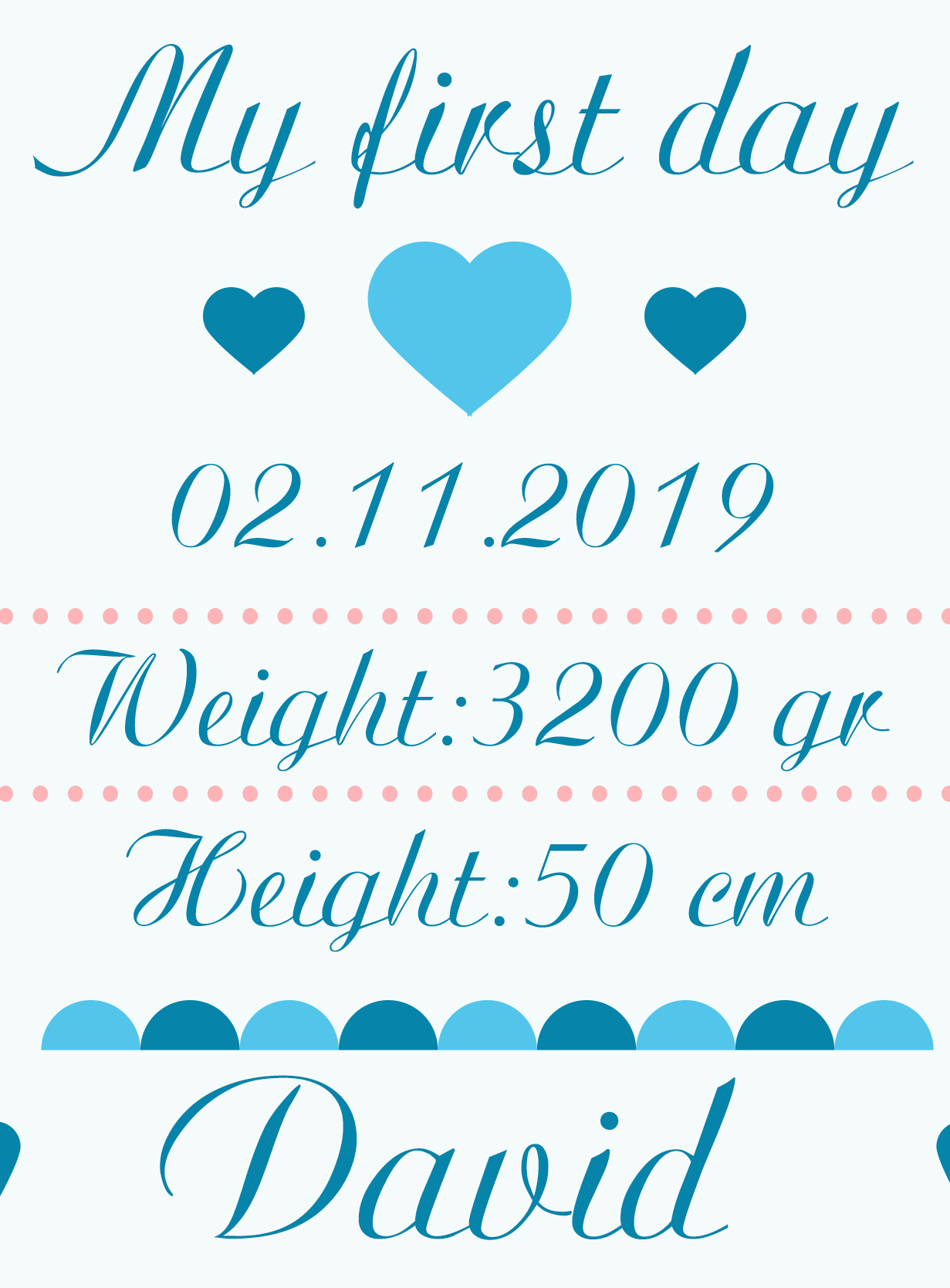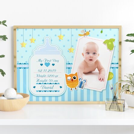 Părinții care doresc să păstreze în camera copilului una din cele mai dragi imagini din viața lor, atunci când o viață a luat naștere din iubirea lor, pot personaliza acest tablou cu data nașterii, greutatea micuțului, înălțimea și numele lui și cele mai dragi fotografii.