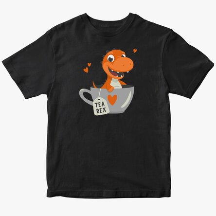 Tricou haios pentru copii, cu un dinozaur într-o ceașcă și mesajul „Tea-Rex” – un joc de cuvinte amuzant și un design adorabil, perfect pentru micii fani ai dinozaurilor și distracției!