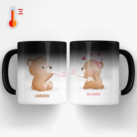 Efect wow: neagră când e rece, cu fotografii când e fierbinte. Cana termosensibilă este un cadou deosebit pentru orice destinatar.
