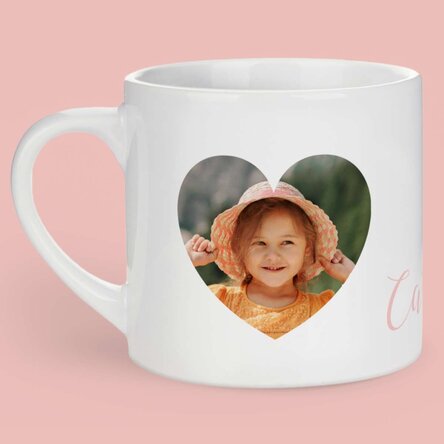 Dăruiește persoanei iubite momentele voastre cele mai dragi prin căni personalizate cu toartă în formă de inimă.
