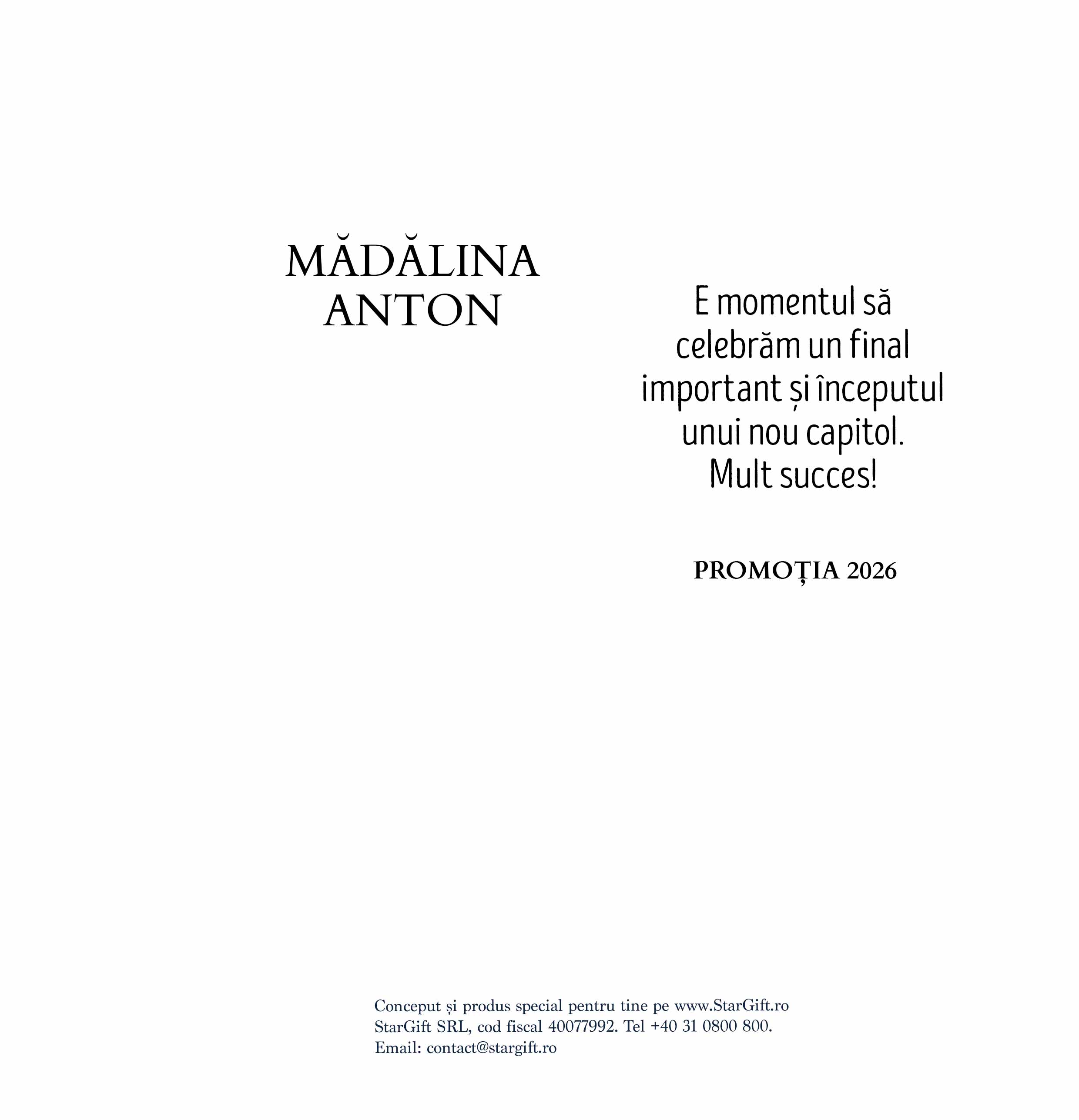 „De fiecare dată când aleg StarGift, știu că fac cea mai bună alegere. Produsele lor sunt mereu pe gustul meu — inspirate, de calitate și perfecte pentru a deveni cele mai reușite cadouri. Fiecare achiziție a fost o bucurie, iar atenția lor la detalii face diferența. Recomand cu drag StarGift pentru oricine caută daruri cu suflet și inspirație!”